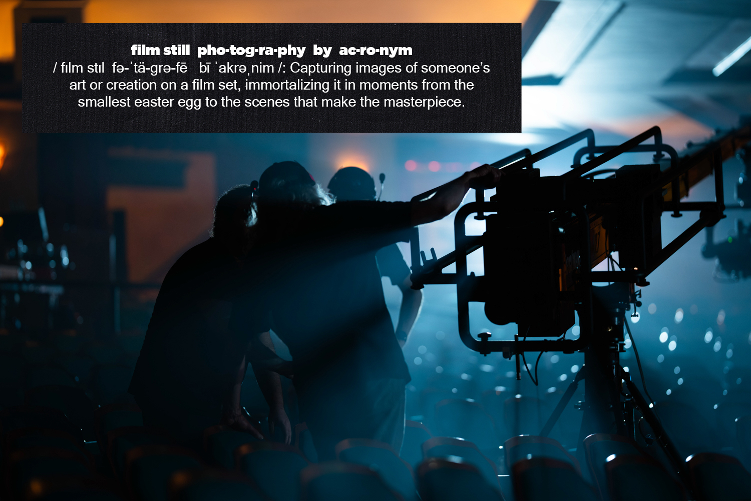 film still pho·tog·ra·phy by ac·ro·nym / fɪlm stɪl fə-ˈtä-grə-fē bī ˈakrəˌnim /: Capturing images of someone’s art or creation on a film set, immortalizing it in moments from the smallest easter egg to the moments that make the masterpiece.